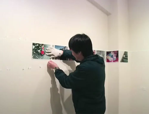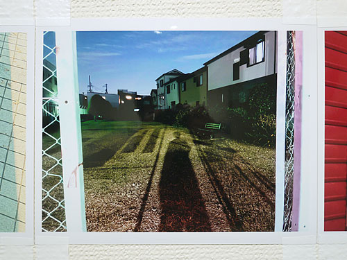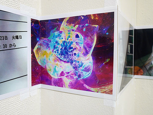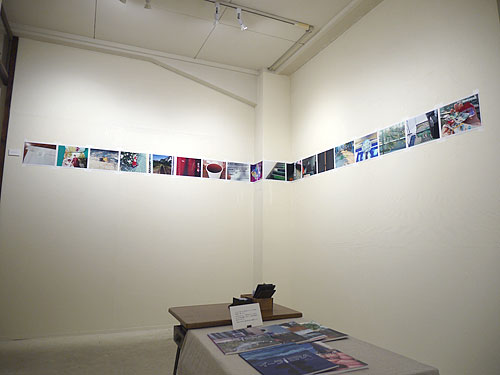 今回も壁の端や柱の角は無視し、プリントを折ったり曲げたりしてでもひたすら真っすぐに写真を並べました。どんなことにも待ったなしで流れ続ける「時間」の可視化をしたいのだろうと思っています。今後もこの方針で展示します。